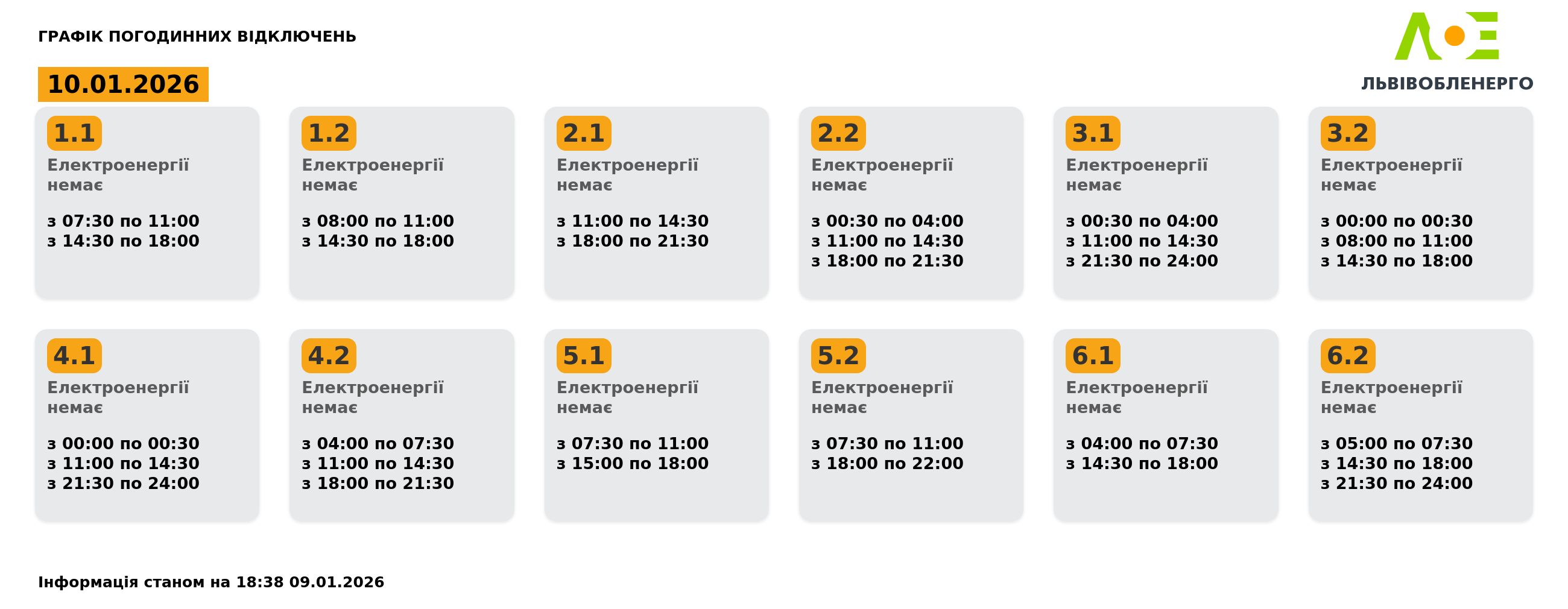 Львівобленерго оприлюднило графік погодинних відключень на 10.01.2026,
