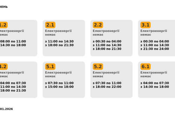 Група 4.1. Електроенергії немає з 00:00 до 00:30, з 11:00 до 14:30, з 21:30 до 24:00.