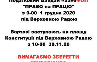 Податковий майдан #SaveФОП "Право на працю" оприлюднив у Фейсбуці свої вимоги, пише DailyLviv, які будуть висунуті 1 грудня під стінами Верховної Ради у Києві: