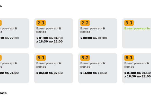 Група 4.1. Електроенергії немає з 04:30 до 07:30, з 16:00 до 18:30.