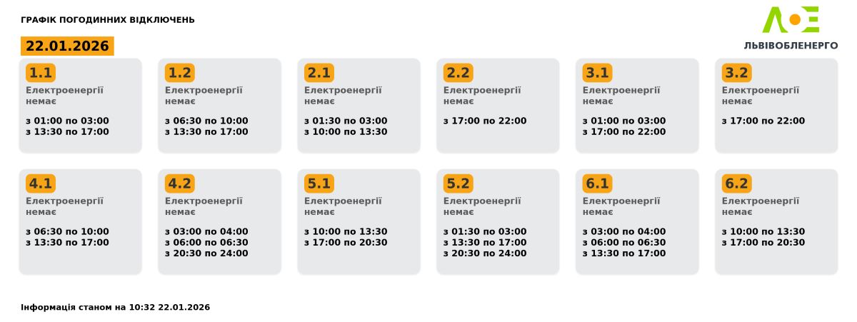 Станом на 10:32 енергетики «Львівобленерго» оновили графік погодинних відключень на 22 січня. Завдяки покращенню ситуації в енергосистемі, кількість обмежень для мешканців Львівщини суттєво зменшено.
