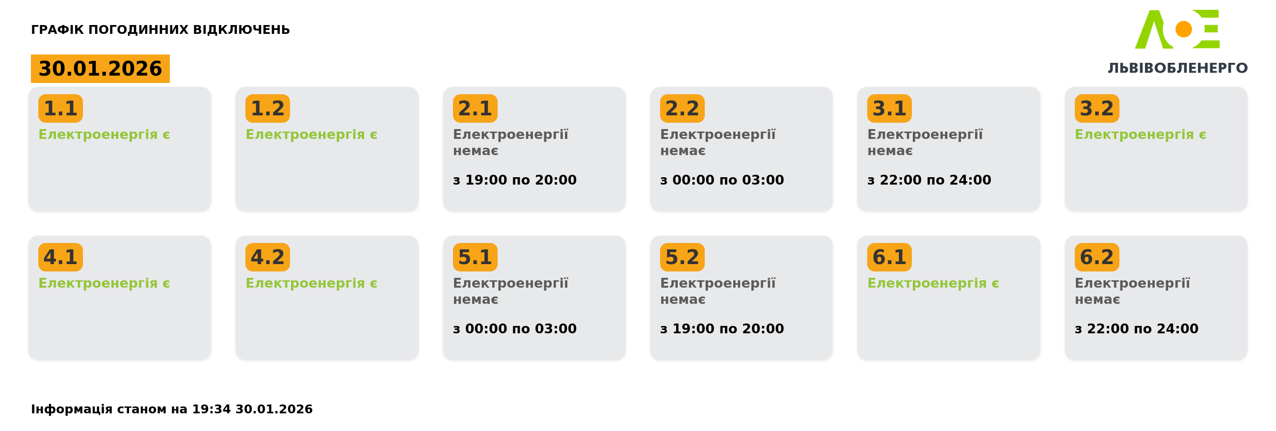 Група 2.1. Електроенергії немає з 19:00 до 20:00.