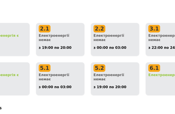 Група 6.2. Електроенергії немає з 22:00 до 24:00.