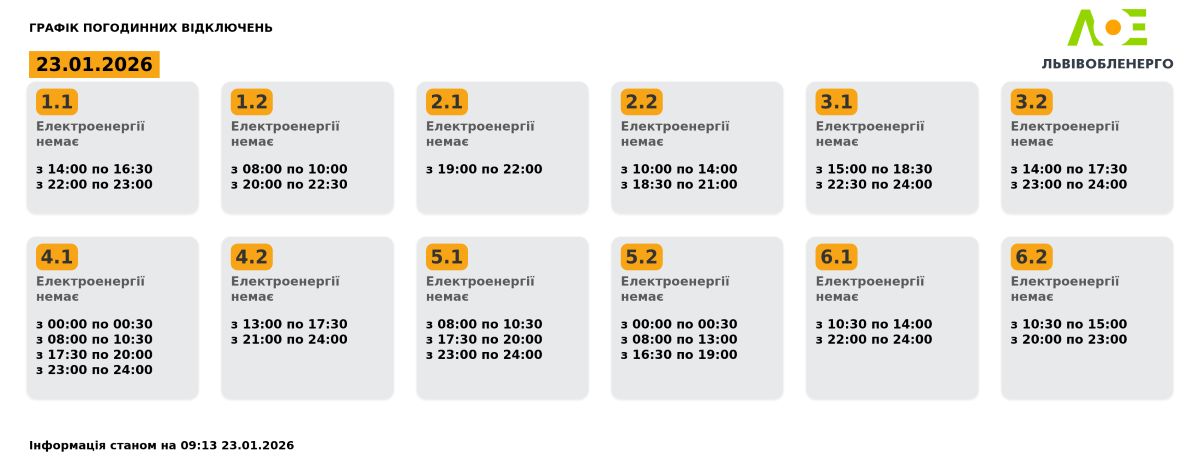Група 1.1. Електроенергії немає з 14:00 до 16:30, з 22:00 до 23:00.