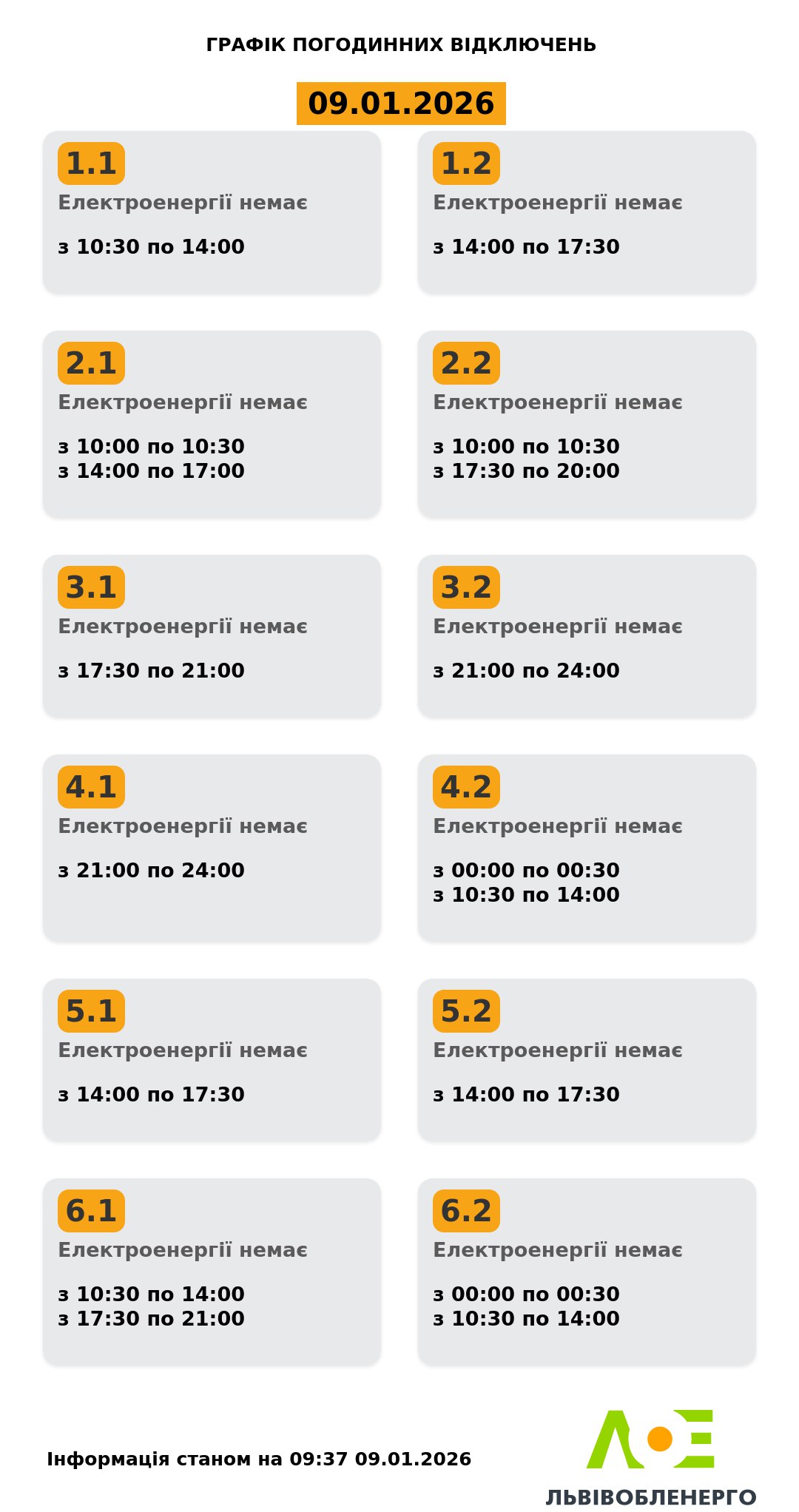 Порівняльний аналіз графіків відключень на 9 січня 2026 року станом на 09:12 та 09:37 свідчить про значне погіршення ситуації для частини споживачів. В останньому варіанті додано нові блоки відключень та розширено чинні інтервали.