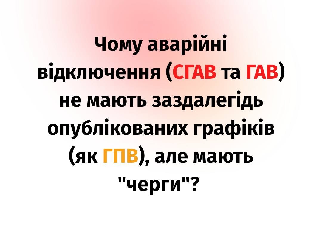 Нещодавно, після застосування аварійних вимкнень, компанія отримала численні запитання про те, де можна знайти відповідні графіки. Енергетики наголосили, що для аварійних відключень заздалегідь опублікованих графіків не існує.