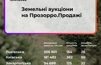 Станом на 14 січня за даними аналітичного модуля Прозорро.Продажі оголошено 1824 аукціони з оренди та ще 906 — з продажу землі.