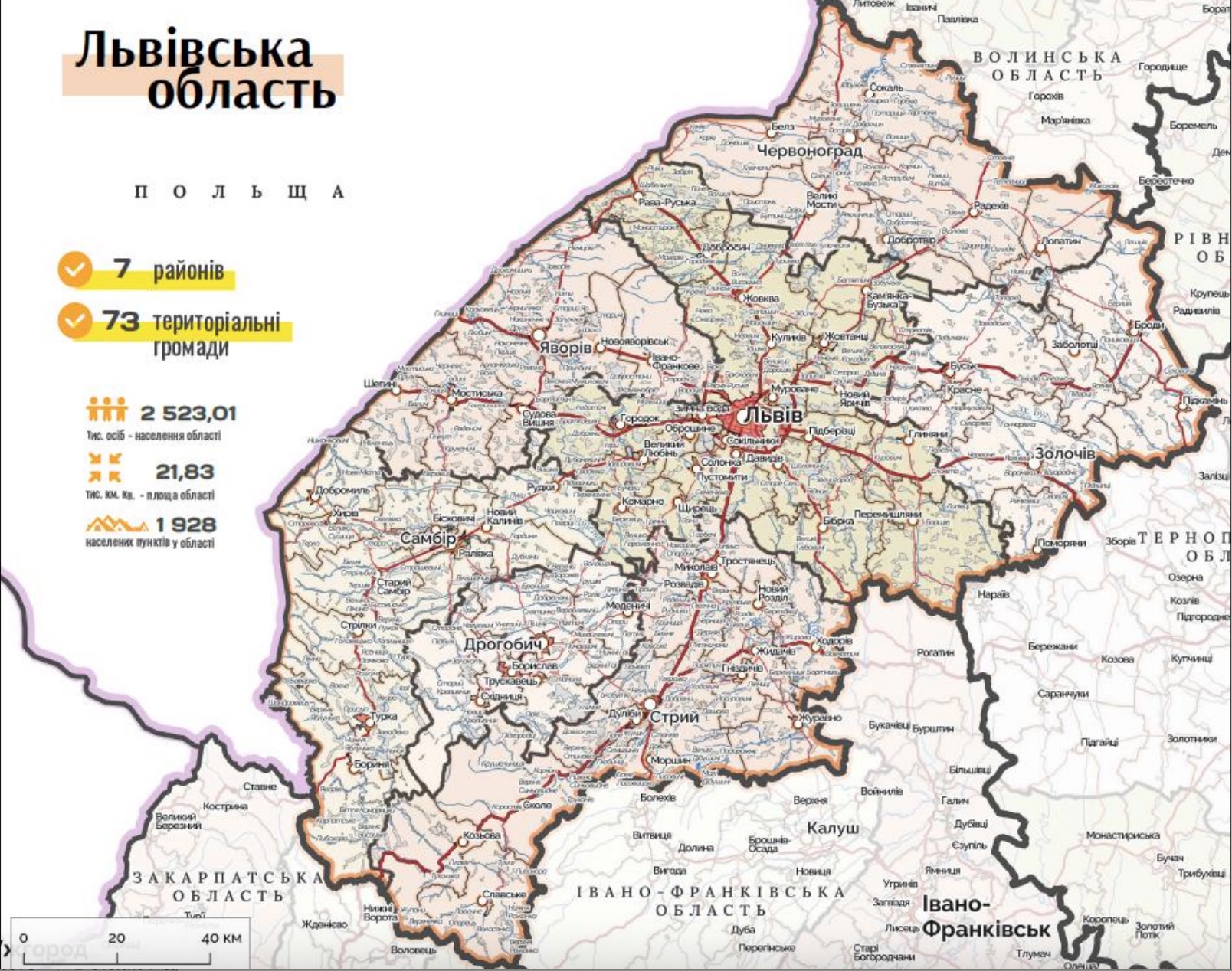 Кількість територіальних громад (ТГ) у Львівському районі – 23, що значно вище порівняно з іншими районами. Це вказує на складну структуру адміністративного управління в умовах високої щільності населення та урбанізованості.