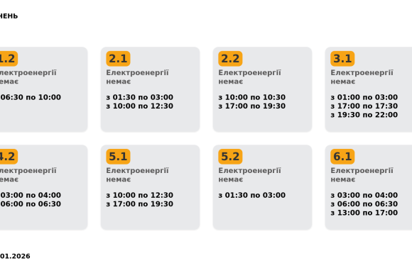 Група 1.1. Електроенергії немає з 01:00 до 03:00, з 13:00 до 17:00.