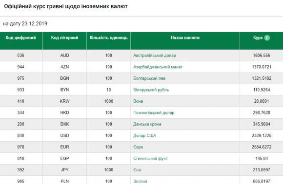Національний банк України зафіксував офіційний курс гривні на рівні 23,2912 гривні за долар (у суботу – 23,3253) та 25,8463 – за євро (21 грудня – 25,8841).