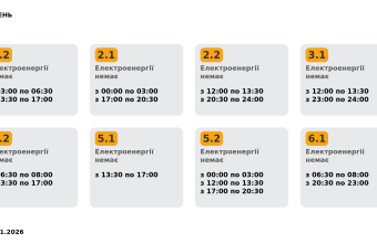 Група 5.2. Електроенергії немає з 00:00 до 03:00, з 12:00 до 13:30, з 17:00 до 20:30.