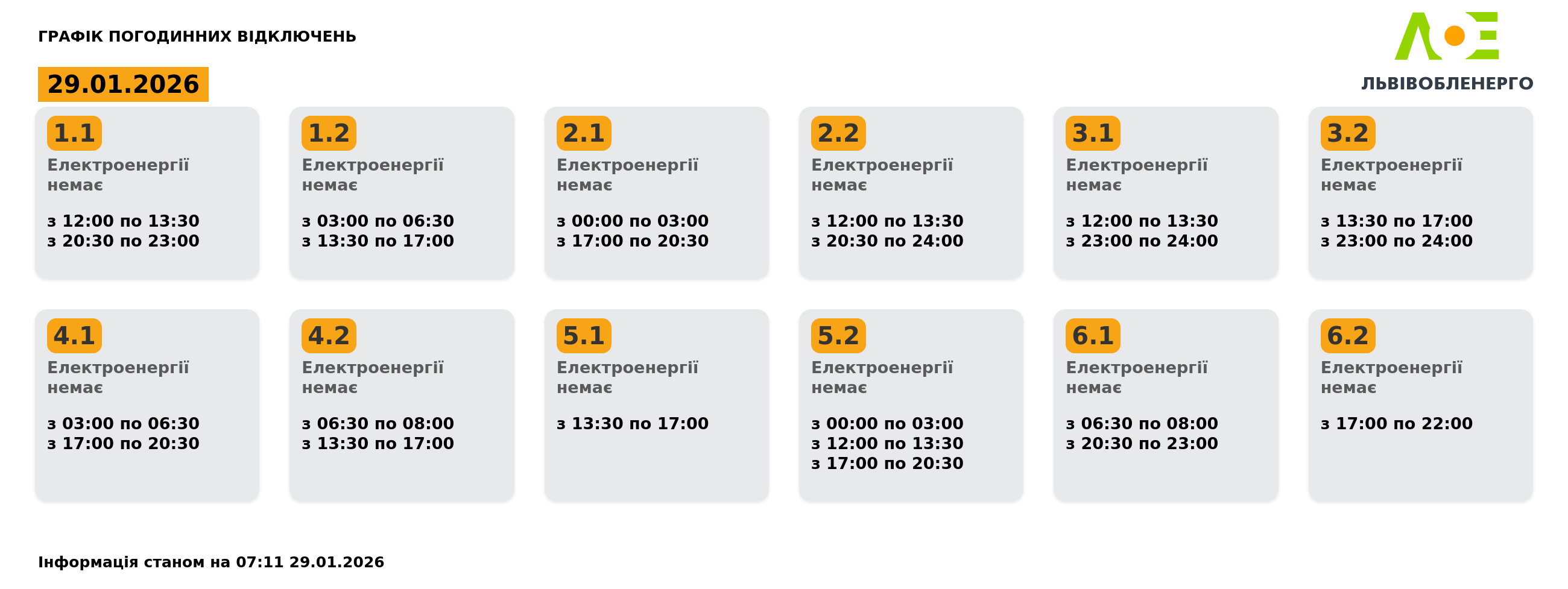 Група 1.1. Електроенергії немає з 12:00 до 13:30, з 20:30 до 23:00.