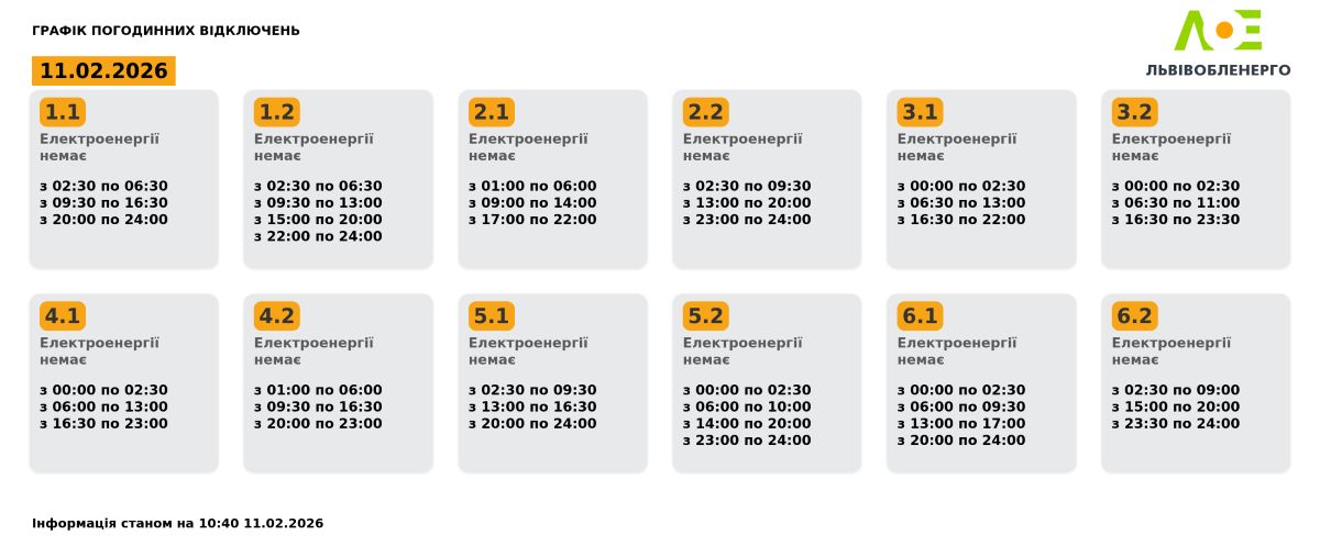 Група 1.1. Електроенергії немає з 02:30 до 06:30, з 09:30 до 16:30, з 20:00 до 24:00.