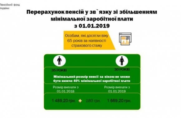 Зокрема, з 1 січня 2019 року підвищені пенсії отримуватимуть внаслідок проведення чергового перерахунку пенсій військові пенсіонери. Із 1 січня 2019 року відбудеться також підвищення мінімальної пенсії на 172 гривні до 1669 гривень для громадян України, яким більше 65 років і котрі мають стаж роботи не менше 30 років для жінок та 35 – для чоловіків.