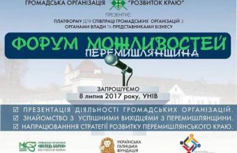 У Львівській облдержадміністрації повідомили сьогодні, 29 червня: «У суботу, 8 липня, на Львівщині стартує унікальна подія – «Форум можливостей для Перемишлянського району», на який запрошують громадські організації з усієї області, аби поділитися досвідом успішних проектів. У програмі заходу: презентація діяльності та проектів районних, обласних та місцевих громадських організації; історії успіху вихідців з Перемишлянського краю; спільне напрацювання стратегічних напрямків розвитку для Перемишлянського району».