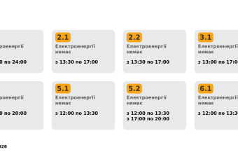 Група 5.2. Електроенергії немає з 12:00 до 13:30, з 17:00 до 20:00.
