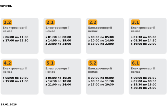 Група 1.1. Електроенергії немає з 00:00 до 01:30, з 05:00 до 08:30, з 12:00 до 15:30, з 19:00 до 23:00.