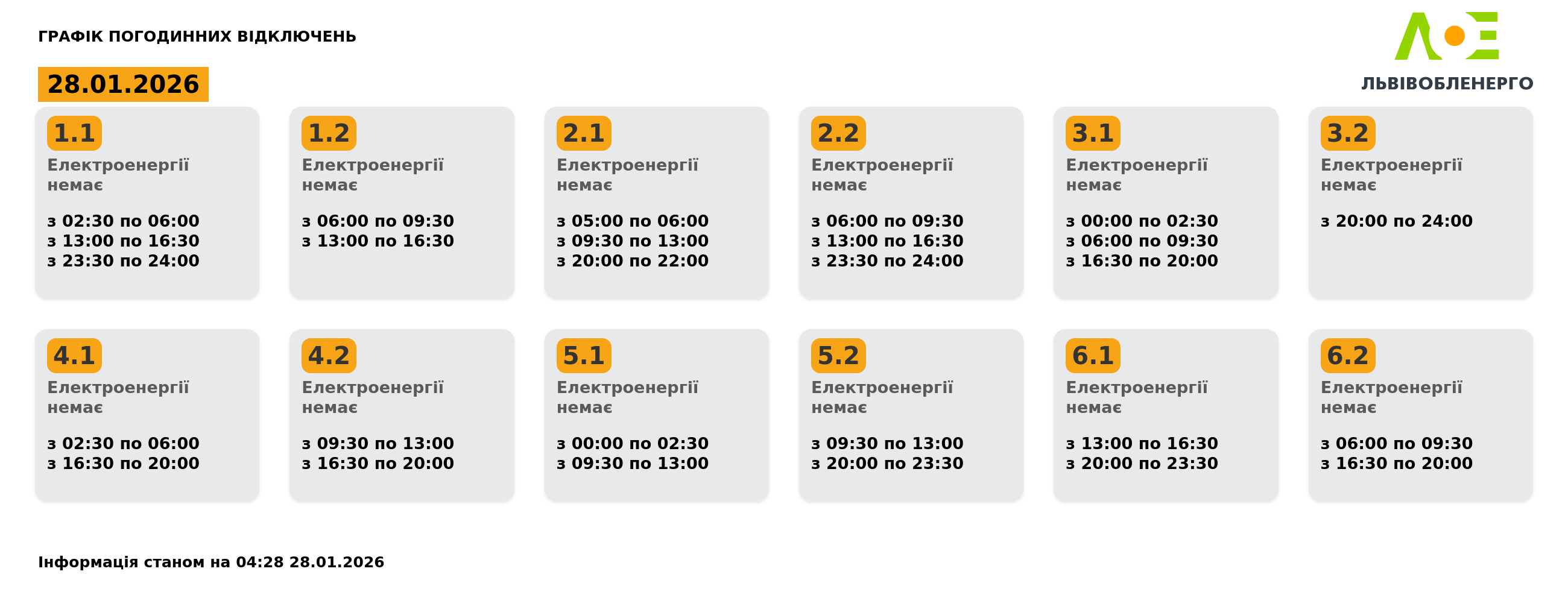 Графік електропостачання на Львівщині 28 січня. Ранковий варіант