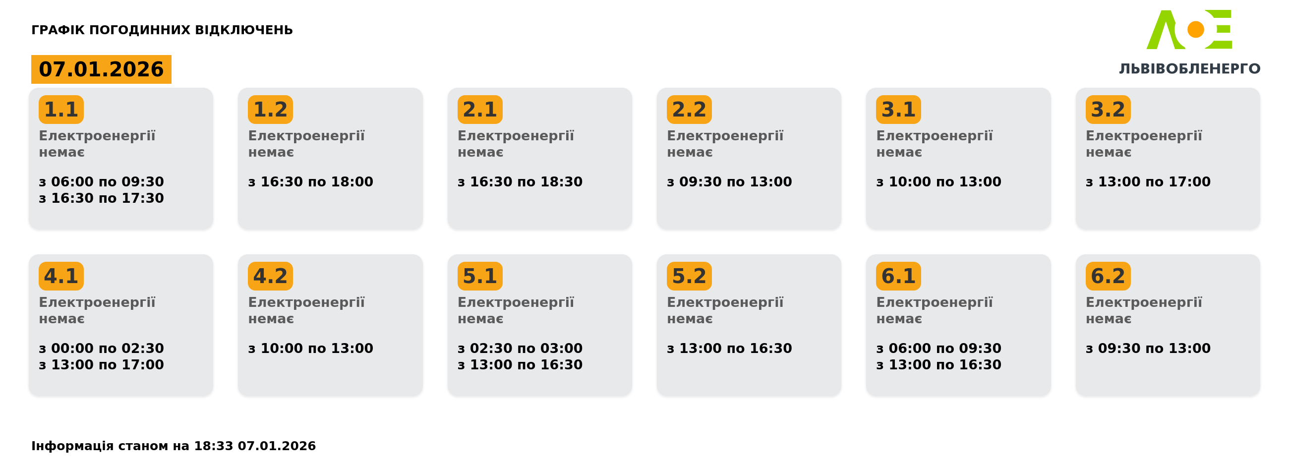 Група 1.1. Електроенергії немає з 06:00 до 09:30, з 16:30 до 17:30.