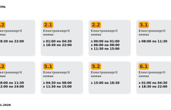 Група 2.2. Електроенергії немає з 00:00 до 01:00, з 06:00 до 08:00, з 11:30 до 15:00.