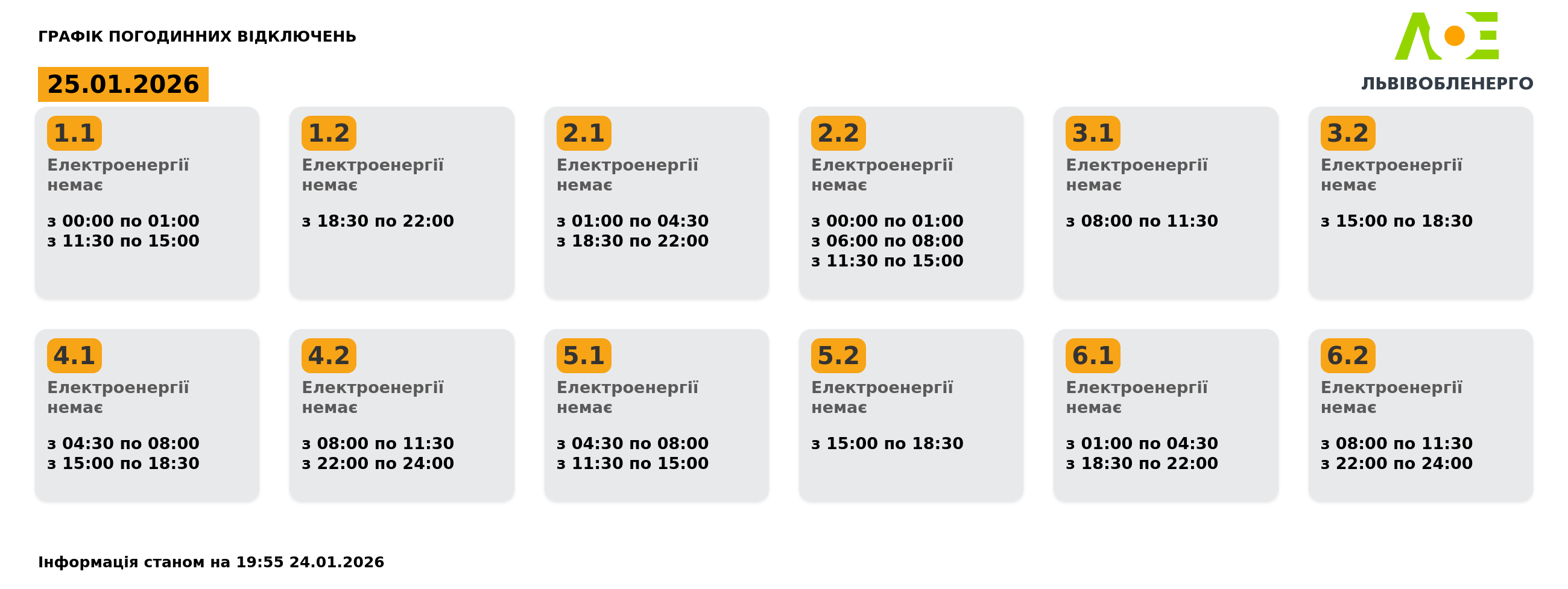 Львівобленерго оприлюднило графік погодинних відключень на 25 січня, пише DailyLviv.com.
