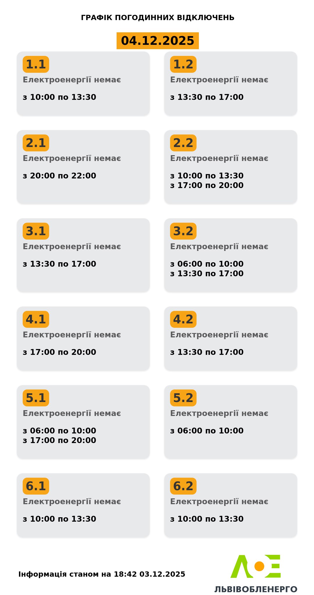 Графік погодинного відключення електроенергії у Львівській області у четвер, 4 грудня: