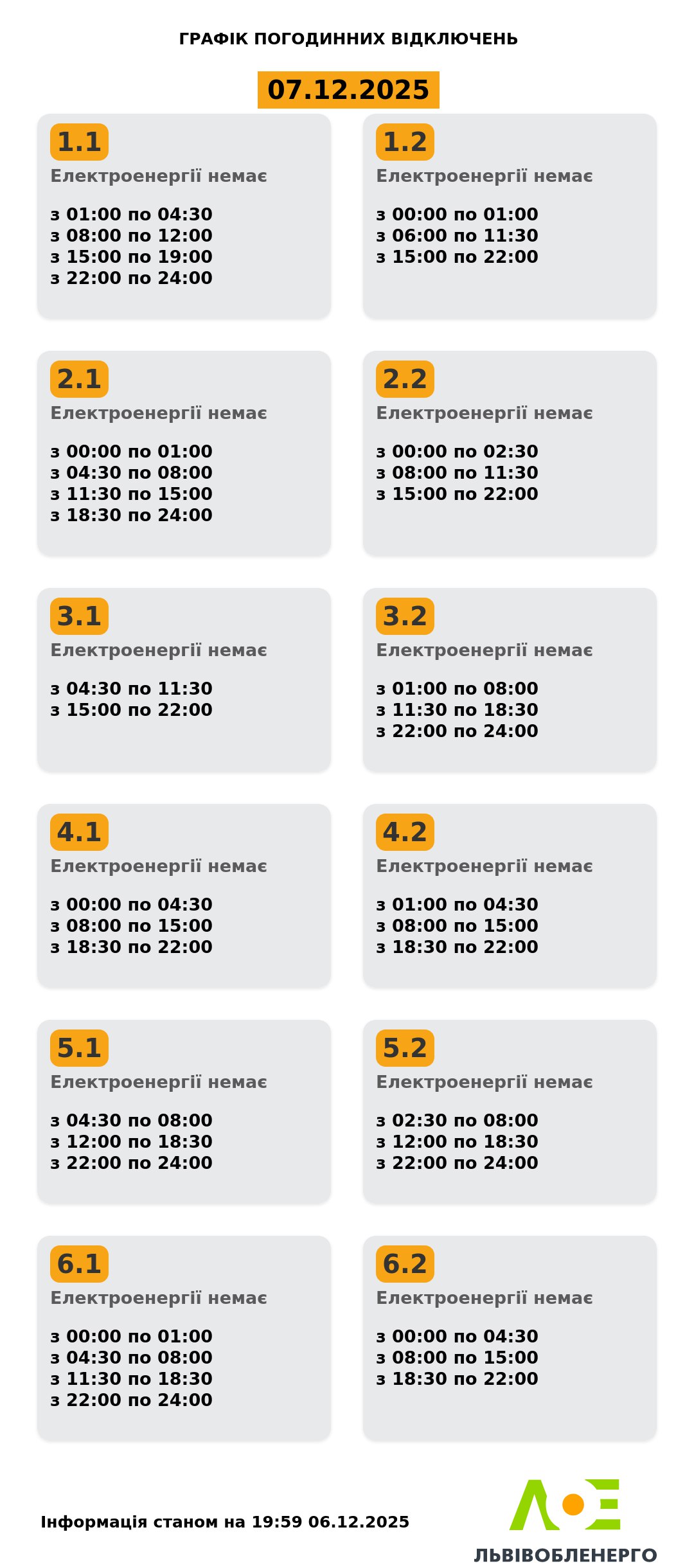 Графік погодинного відключення електроенергії у Львівській області у неділю, 7 грудня: