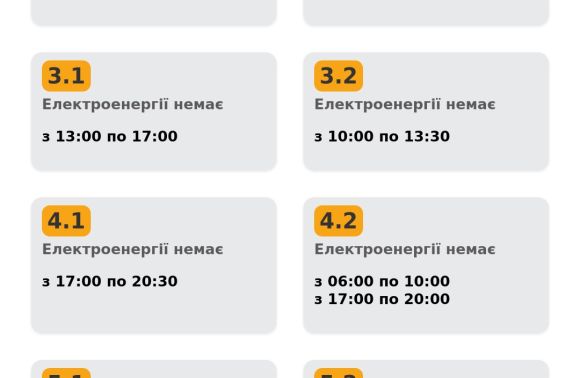 Група 5.2. Електроенергії немає з 10:00 до 13:30, з 17:00 до 20:00.