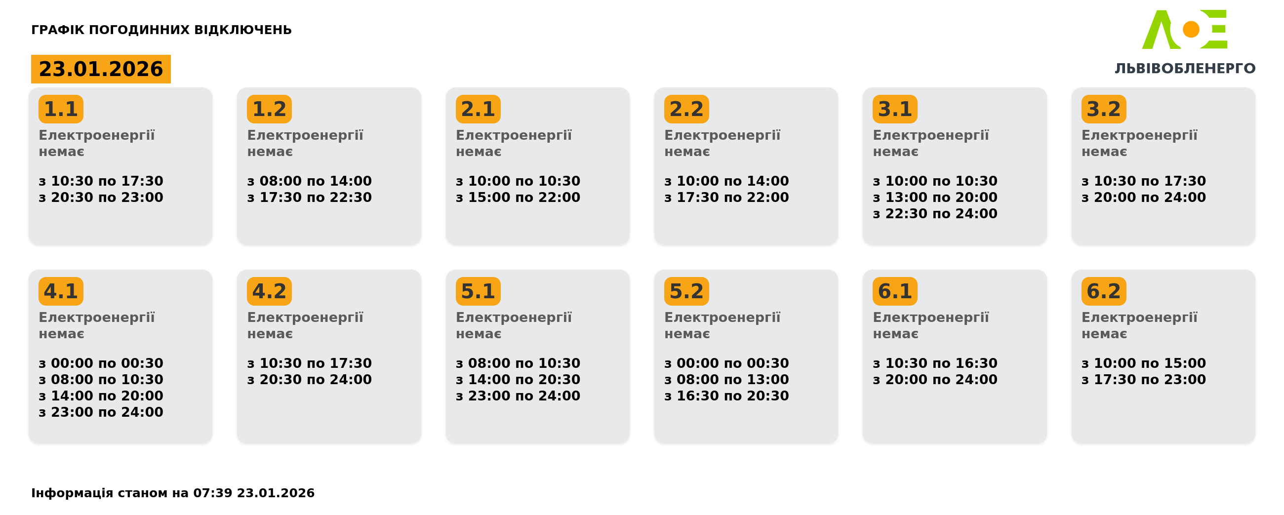 Група 6.2. Електроенергії немає з 10:00 до 15:00, з 17:30 до 23:00.