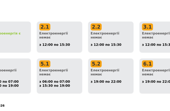 Група 6.2. Електроенергії немає з 06:00 до 07:00, з 15:30 до 19:00.