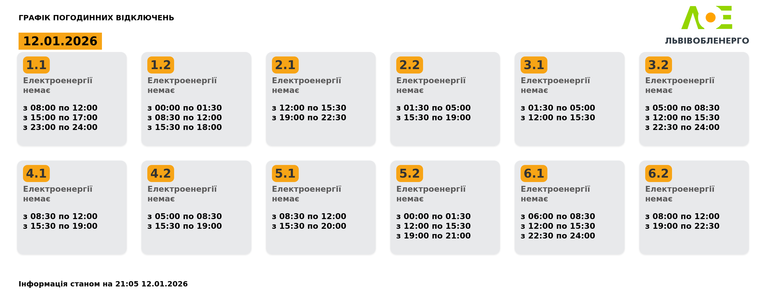 Львівобленерго скоригувало графік погодинних відключень на 12.01.2026, пише DailyLviv.com.