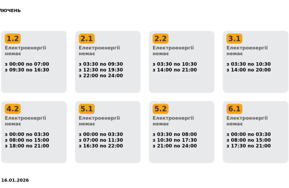 - Група 6.2: Час обмежень скорочено на 1,5 години. Денне вимкнення завершилося об 11:30 замість запланованої 13:00. За розпорядженням "Укренерго" графіки 16 січня застосовуватимуть в усіх областях.