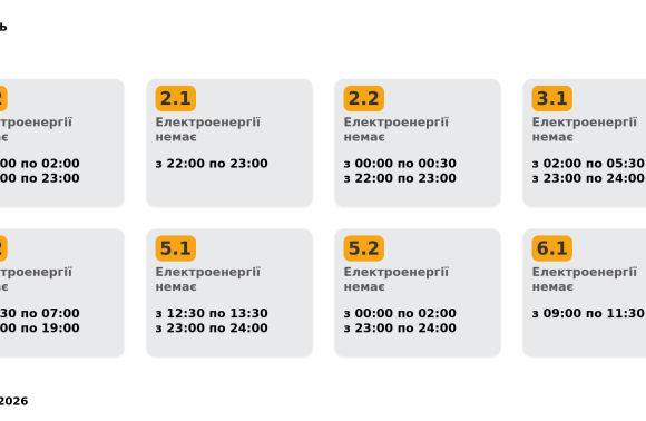 | 6.1 | 19:30 – 22:00 | Скасовано вечірнє | Світло буде весь вечір |
