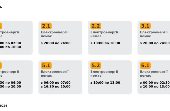 Група 6.2. Електроенергії немає з 02:30 до 06:00, з 13:00 до 16:30.