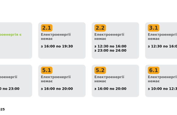 Група 2.1. Електроенергії немає з 16:00 до 19:30.