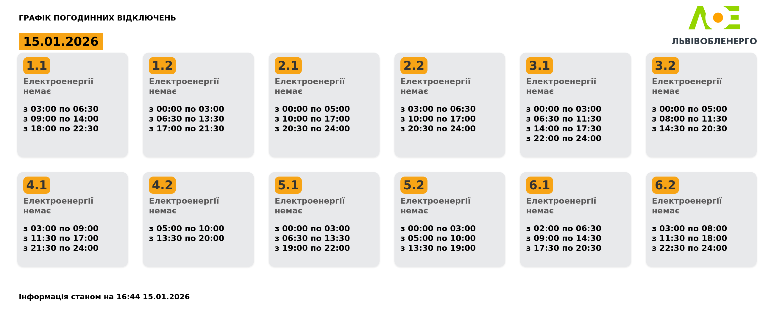 Графік погодинних відключень 15.01.2026 станом на 16:44: