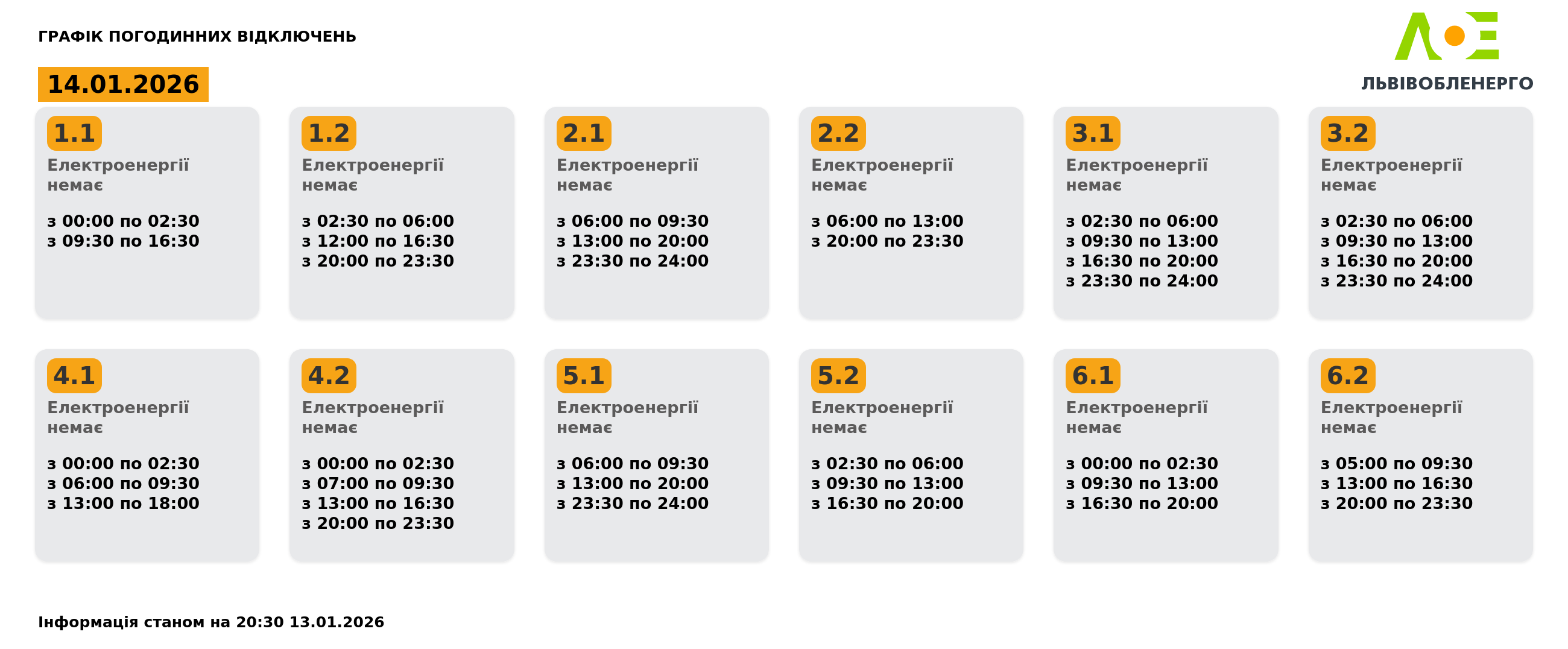Тривалість вимкнень упродовж доби 14.01.2026 за графіком станом на 20:30 - від 9,5 до 12 годин: