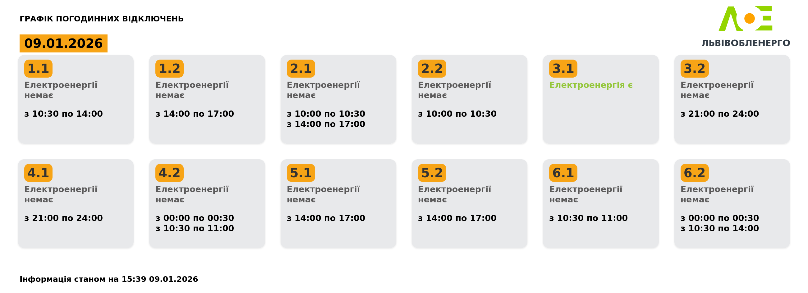Група 2.1. Електроенергії немає з 10:00 до 10:30, з 14:00 до 17:00.