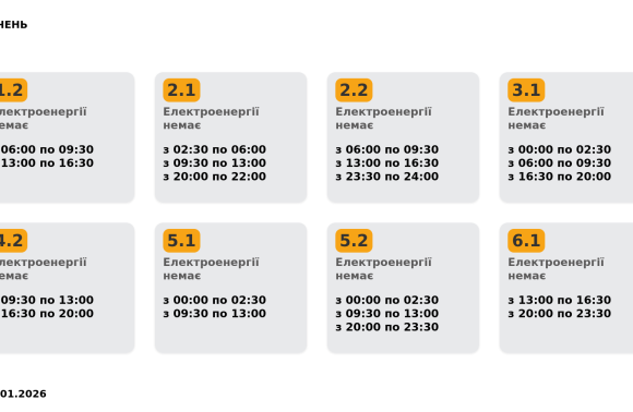 Група 3.1. Електроенергії немає з 00:00 до 02:30, з 06:00 до 09:30, з 16:30 до 20:00.