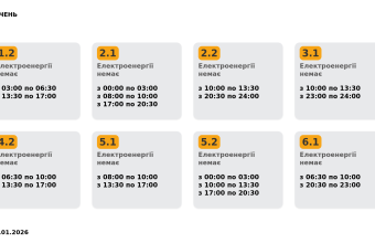 Група 5.2. Електроенергії немає з 00:00 до 03:00, з 10:00 до 13:30, з 17:00 до 20:30.