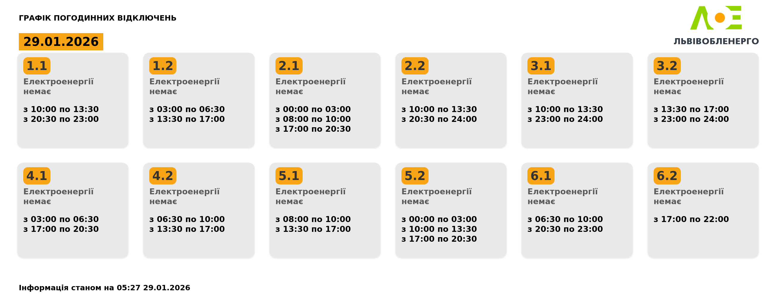 УВАГА. ОНОВЛЕННЯ о 7.11: Друга ранкова зміна у графіку вимкнень електроенергії 29 січня на Львівщині скасувала кілька періодів вимкнень світла. Про це повідомило ПрАТ «Львівобленерго», пише DailyLviv.com.