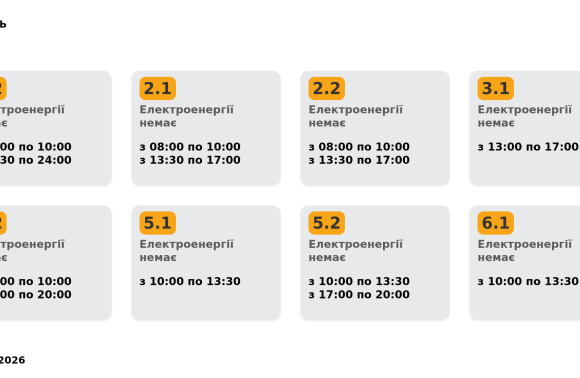 Група 2.1. Електроенергії немає з 08:00 до 10:00, з 13:30 до 17:00.