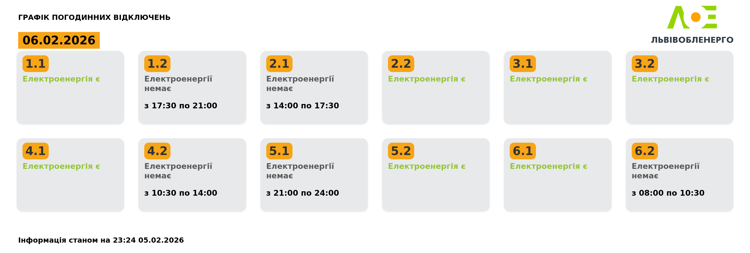 Львівобленерго оновило графік погодинних відключень на 6 лютого, пише DailyLviv.com.