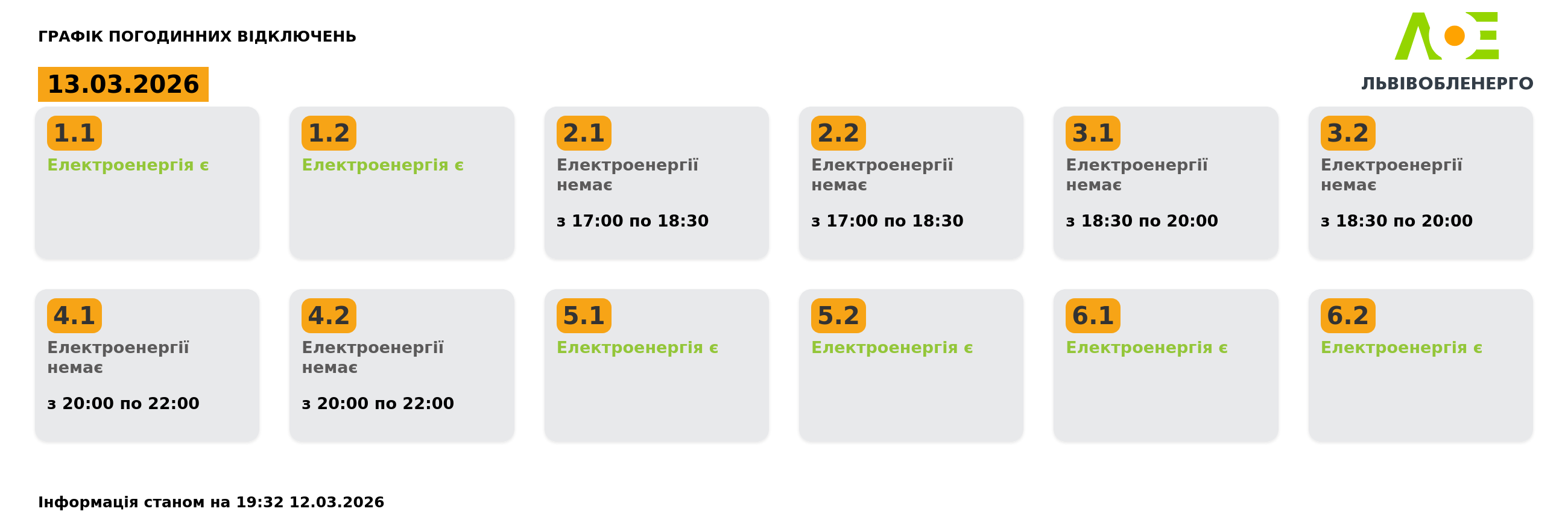 Графік відключення світла 13 березня на Львівщині