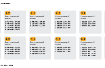 Група 1.1. Електроенергії немає з 01:00 до 04:30, з 08:00 до 11:30, з 15:00 до 18:30.