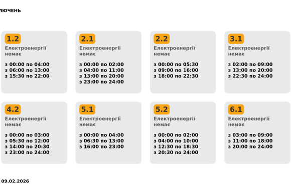 Група 3.2. Електроенергії немає з 02:00 до 09:00, з 12:00 до 18:00, з 20:00 до 24:00.