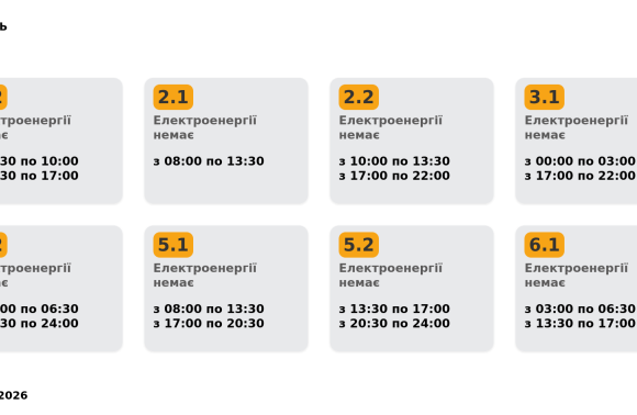 Група 6.2. Електроенергії немає з 08:00 до 13:30, з 17:00 до 20:30.