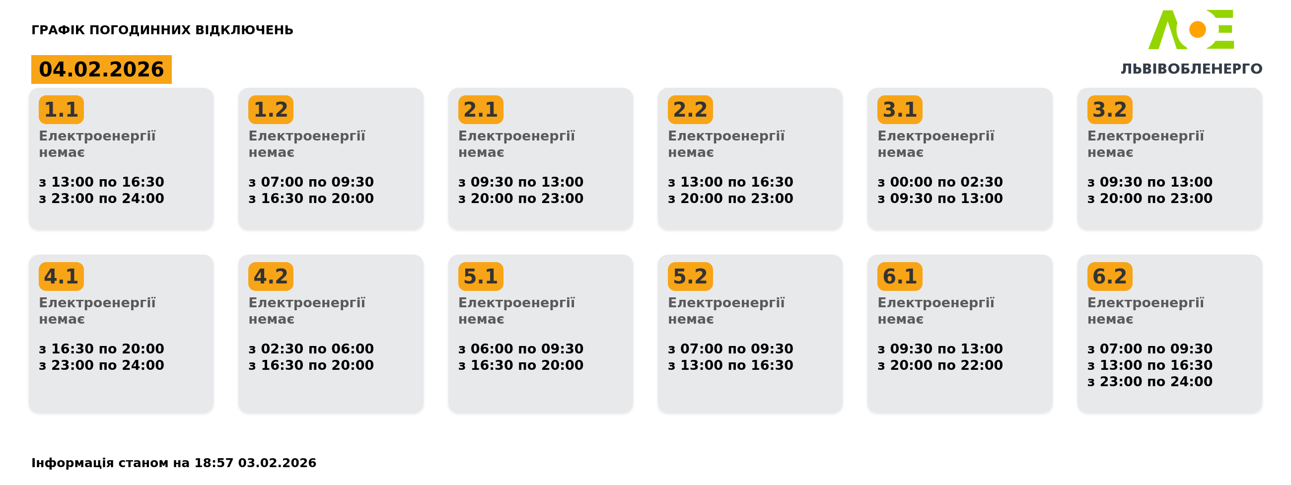 Львівобленерго підготувало графік погодинних відключень на 04.02.2026, пише DailyLviv.com.