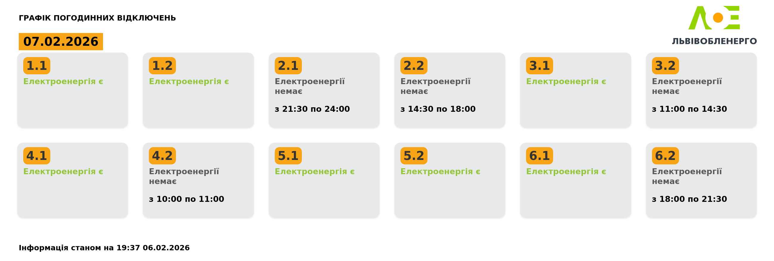 Графік погодинних відключень на 7 лютого станом на 19:37 06.02:
