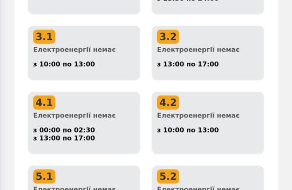 Група 5.2. Електроенергії немає з 13:00 до 16:30, з 20:00 до 23:30.